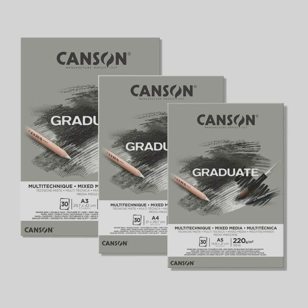 Canson® Graduate Mixed Media pads feature grey, durable, double-sided (textured and smooth) paper. This paper has the ideal characteristics for bringing out colours and creating depth in your work; by adding white or black, you can easily amplify the shadows and contrasts. The pads contain 20 sheets of 220gsm paper, perfect for mixing techniques and achieving optimal results!