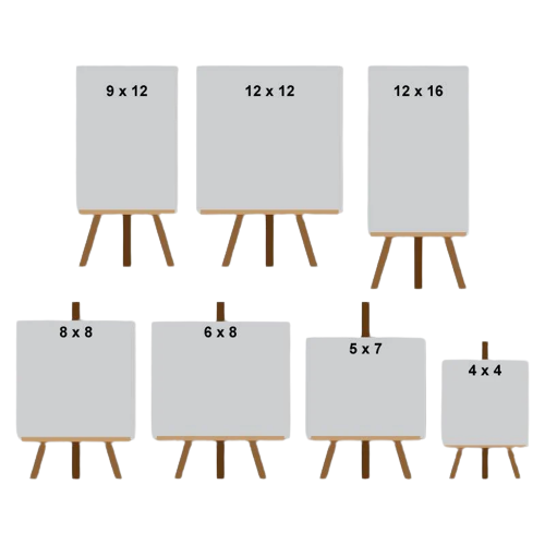 3.5 x 3.5. 4 x 4, 5 x 7, 6 x 8, 8 x 8, 8 x 10, 9 x 12, 12 x 12, 12 x 16