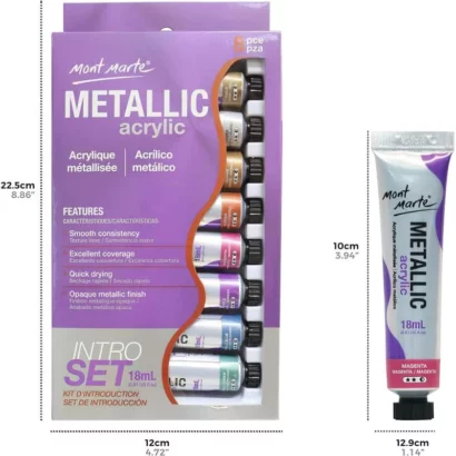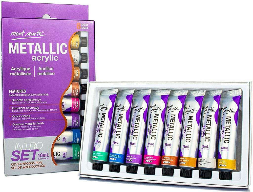 Mont Marte metallic acrylic paints are a great choice for adding shimmer and shine to your art and craft projects. This set of 8 beautiful colors features a luxurious metallic sheen and is suitable for a range of surfaces.